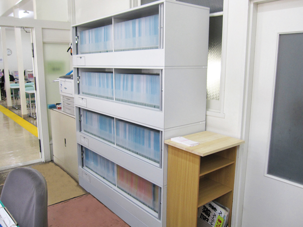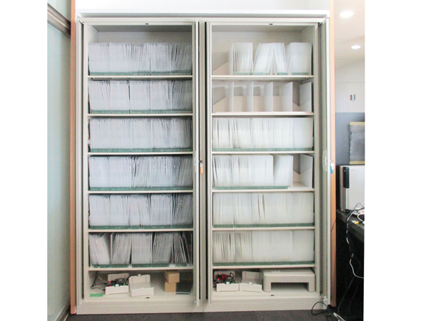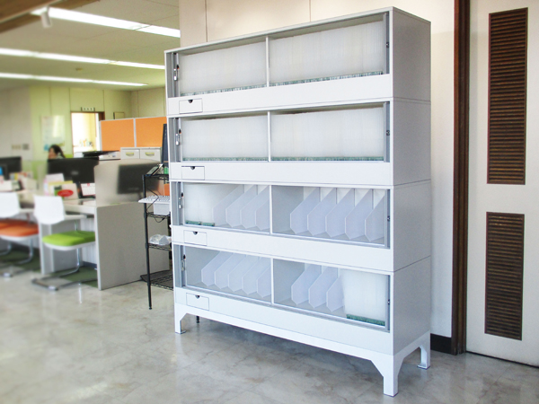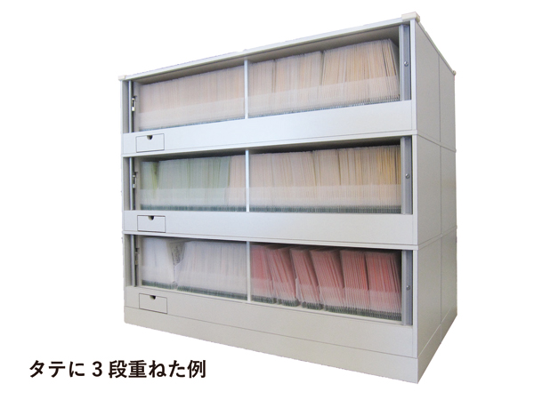 | ■サイズ:W1,500×H400×D450㎜ ■収納数:200枚/段 ■サイドシャッター。カギ付き。 |