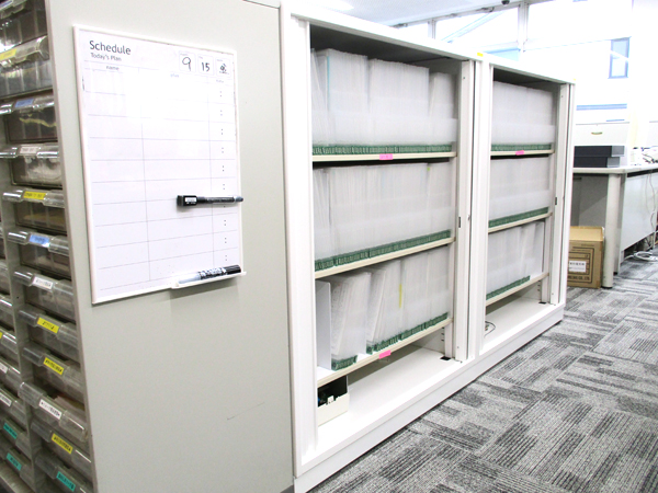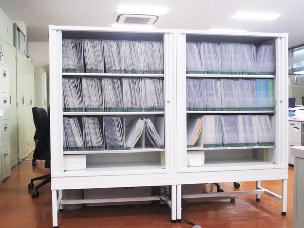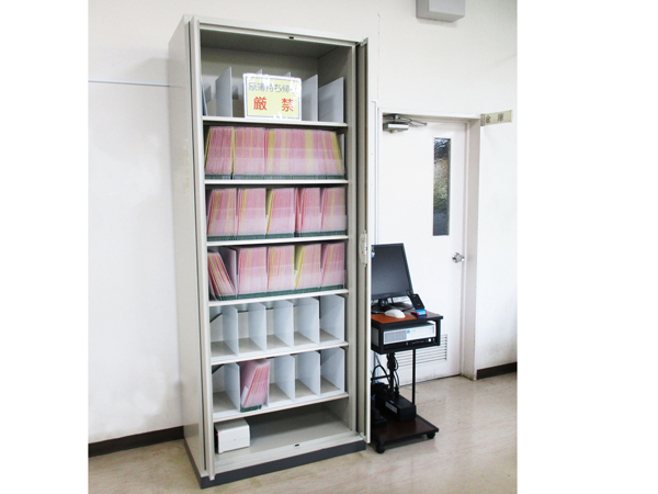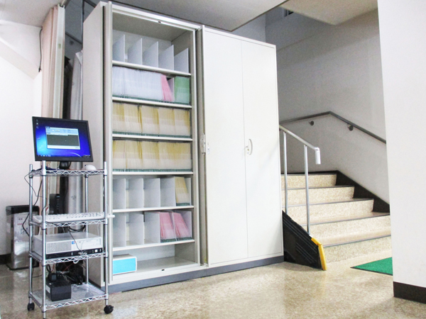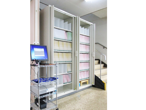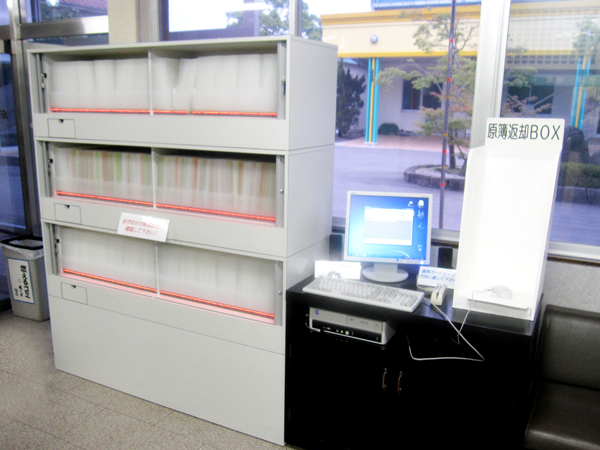 | 原簿紛失事故を回避 制御パソコンで原簿の持ち出し日時を管理。保管ラックに返却されたフォルダは自動的に返却処理されます。 また、誤って別のフォルダを持ち出した場合にアラームが鳴るように設定することもできます。(オプション仕様。KR-Ⅰのみ)。